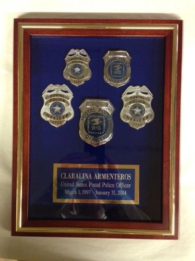 Comes complete with distinctive gold accent molding, 1/8" glass front and Blue Velour background material. Your supplied badges are mounted above the engraved plate with 3 lines of text.