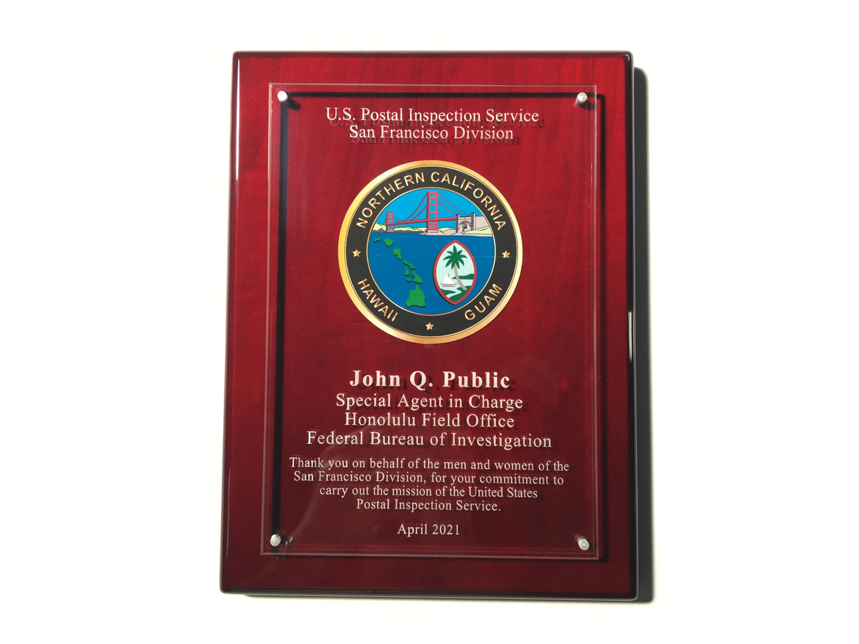 Your full color Agency seal or logo is placed on the surface of the plaque board.